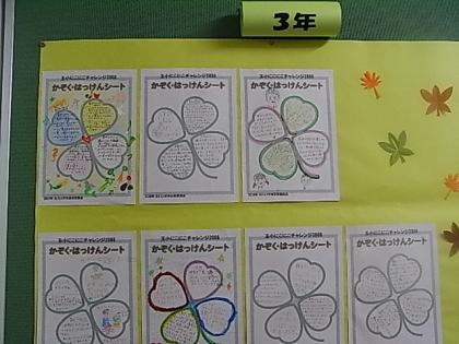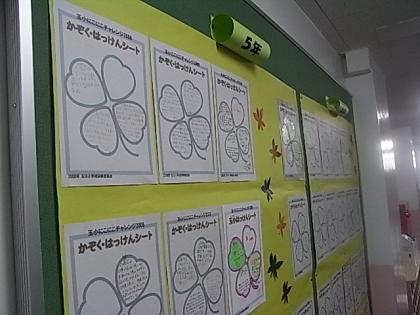 今日、PTA研修委員の方々が、校長室から職員室前の廊下の掲示板に、7月に実施した玉小「にこにこチャレンジ」の成果である「かぞくはっけんシート」を掲示してくださいました。それぞれのはっけんシートを読むと、子どもたちが家族同士の会話に幸せ感をもったり、家族そろっての食事がうれしかったりしている様子が伺えました。また、このチャレンジ期間が子どものことや家族のことを考え直す、とてもいい機会になっていることが保護者の文からわかりました。1枚1枚がとても素晴らしい実践ですね。PTA研修委員会の皆様、4月からここまで、いろいろ苦労が多かったことでしょうか、素晴らしい成果が表れていると思います。ぜひ、ご覧になっていただきたいと思います。また、ご覧になられた方々は、ぜひ研修委員の方へご感想を伝えてあげてください。