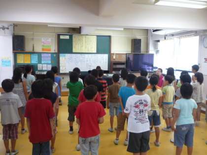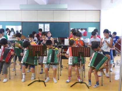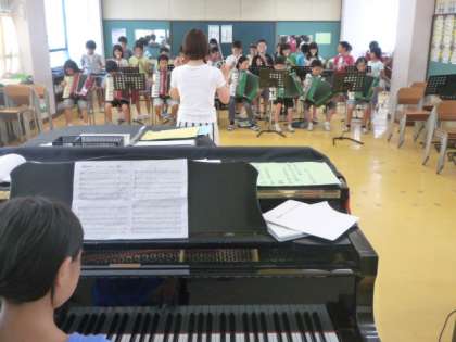 4年2組と4組の音楽の時間に、1学期学んだ曲の音楽会に招待されました。2クラスとも、とても全員の心がひとつにまとまって、すばらしいハーモニーと合奏を聞かせてもらいました。子どもたちの目がとても真剣な輝きで演奏していました。