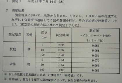 昨日測定した、校庭の放射線量の測定結果が届きましたので、お知らせいたします。数値の解釈については、区からの最終結果が出るまで何とも言えません。測定が終わった他の学校の数値については、世田谷区のホームページに掲載されていますので、比較することはできますのでご覧ください。