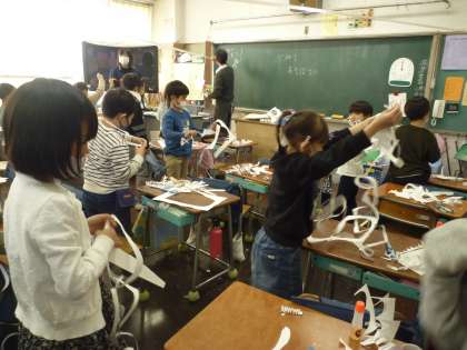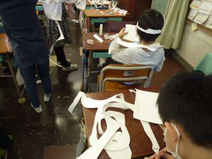 図工の先生のスペシャル授業です。紙を切って、造形遊びをしています。楽しそうに取り組んでいます。