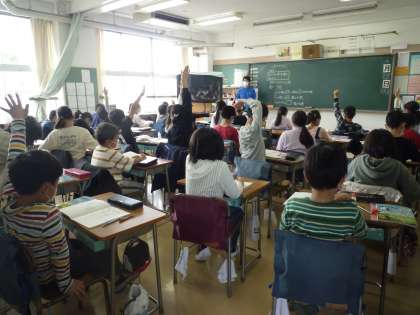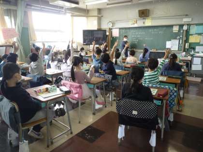 教室では、自分の意見を発表するためにしっかり手を挙げています。