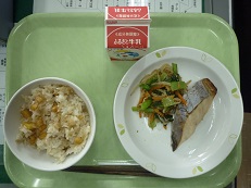 山坂達者飯、魚の西京焼き、ごまあえ、牛乳
