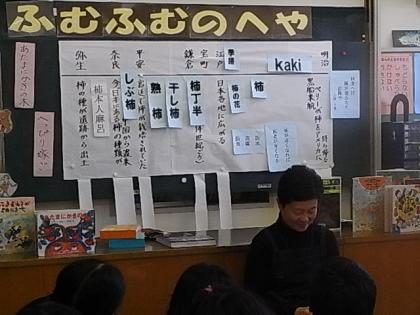 6年生が図書の時間を使って、おはなしバスケットの方々に、日本人が「柿」という食べ物とどのように結びついて生活してきたかについて、ブックトークしてもらう貴重な時間を過ごしました。柿と日本人との歴史や生活の中に根付いていた柿の活用方法、柿にまつわる物語等々を、図書室にある様々な本から紹介してもらいました。柿渋を和紙に染めたものを手作りで持ってきて直接子どもたちに触らせたり、においをかがせたり飽きさせない1時間でした。