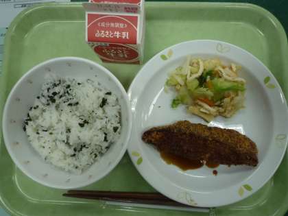 わかめご飯、魚のフライ、野菜の和風ドレッシング、牛乳