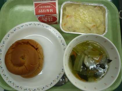 黒砂糖パン、ポテトグラタン、野菜スープ、牛乳