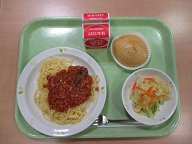 スパゲティ(ミートソース)、野菜のレモンじょうゆかけ、黒砂糖入り蒸しパン、牛乳