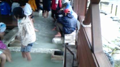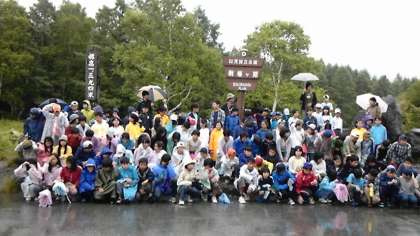いよいよ林間学園のメインイベントである小田代が原ハイキングです。まず、水量の多い華厳の滝を見学。残念ながら小雨が降ってきました。そのあと、卒業写真用で定番の三本杉で記念撮影をし湯ノ湖の源泉と足湯を体験しました。