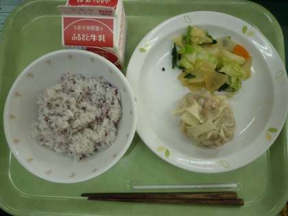ゆかりご飯、しゅうまい、野菜の和え物、牛乳