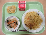 和風スパゲッティ、じゃこサラダ、ポテトクリーム焼き、牛乳