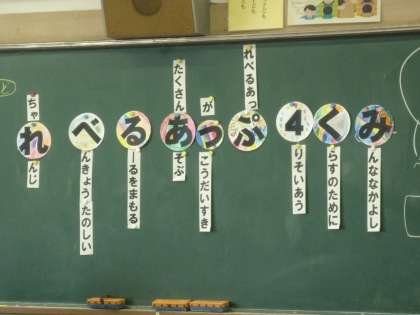 学級の目標が黒板に掲示されています。とても素敵な目標です。心も体もレベルアップしていくことでしょう。