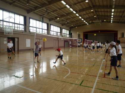 ソフトバレーボールの授業です。友達と協力し、チームで対戦しています。あたたかい声掛けが体育館に響きます。
