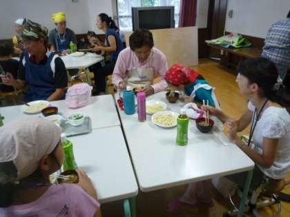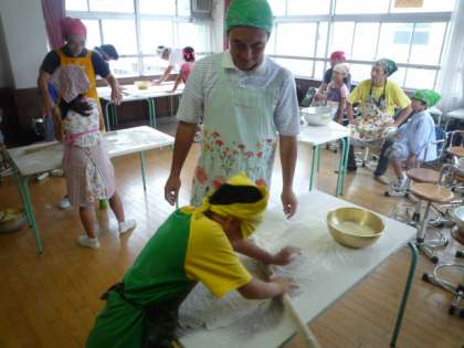 学校協議会主催の手打ちうどん教室では、20組の抽選で選ばれた親子が、9時にランチルームに集まって、校長先生の指導のもと開催されました。うどんだまにするところ、うどん玉を延ばすところ、おうちの人の力を借りながら子どもたちも一生懸命うどん作りに励んでいました。クーラーを止めて汗をかきかき、乙さんやお母さんが力を込めて練っている姿にきっと子どもたちは感動したことでしょう。茹であがったうどんをおいしそうに食べている子どもたちの様子が印象的でした。