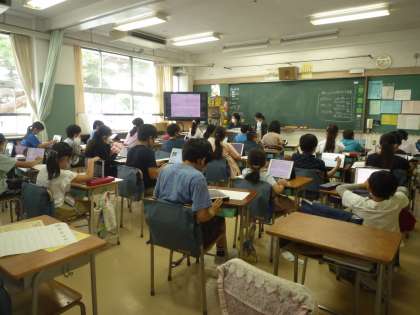 タブレットを使って、調べ学習の発表を行っています。残念ながら学校観戦はなくなりましたが、興味をもつことは大切です。