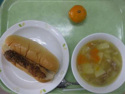 フィッシュバーガー・レンズ豆のスープ・冷凍みかん・牛乳