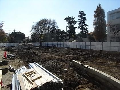 校庭のプレハブ校舎が、ほぼ撤去されて、土台だけの状態になってきました。撤去作業も順調に進んでいます。