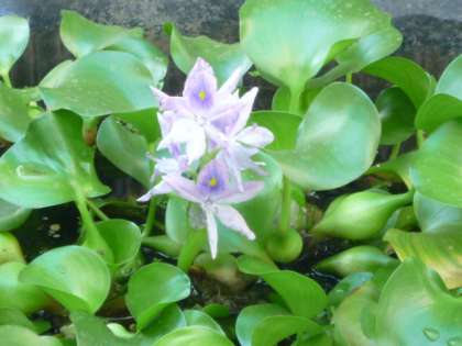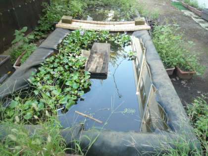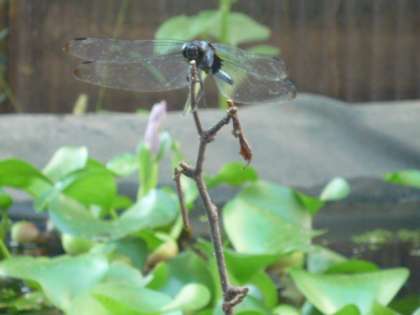 おやじの会の皆さんの力で夏休み直前に出来上がったビオトープですが、夏休みの間にすっかり周りの景色になじんできています。水面のホテイアオイの薄紫の花がきれいです。池の中には小さなメダカがたくさん泳いで、小枝にはトンボが止まっていました。