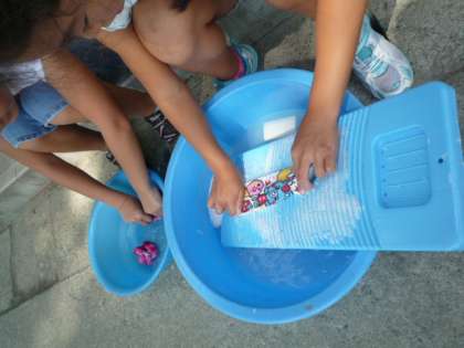 社会科の授業で「むかし使われていたころの生活」についての学習のために、4年生がたらいと洗たく板を使って、使っていたころの人々の体験をしていました。共感することがどこまでできたかわかりませんが、一生懸命自分の靴下はハンカチをごしごしと洗っていました。