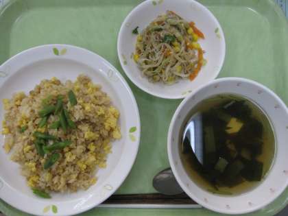 三色丼・じゃこ入りサラダ・すまし汁・牛乳