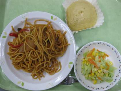 スパゲティナポリタン・コーンサラダ・黒糖蒸しパン・牛乳