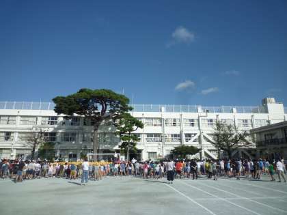 久しぶりの全校朝会。青空のもと全員で集まりました。校舎も子どもたちも先生たちも輝いています。
