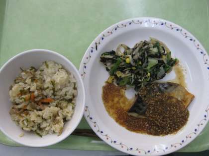 豚肉とごぼうのごはん・さばのごまだれやき・いそあえ・牛乳