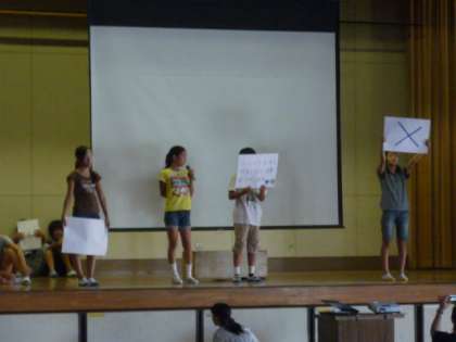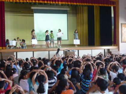環境委員会では、地球温暖化によって、南太平洋の「ツバル」という国が21世紀の後半で水没するかもしれないというDVDを流し、温暖化への注意を促していました。また、学校で温暖化を防ぐ取り組み例をクイズ形式にして、みんなに呼び掛けをしていました。みんなも話を集中して聞いていました。