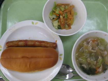 セルフウィンナーサンド・カリカリ豆のサラダ・野菜と春雨のスープ・牛乳