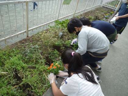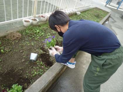 5年生が、校庭の花壇にパンジーとビオラを植えました。丁寧に植えるだけでなく、枯れた草をとる作業も進んでやってくれました。