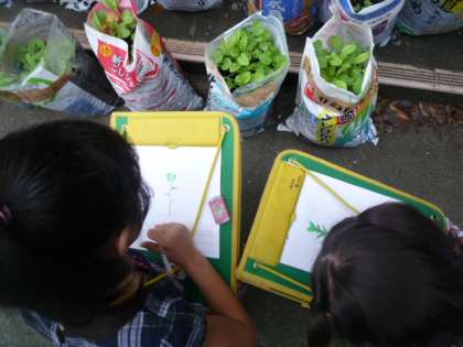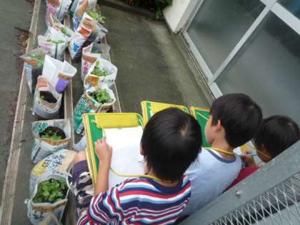 1年生が先々週準備した、ダイコンのためのビニル栽培。よい天気に恵まれて、立派に発芽しています。今日は、生活科の時間を使って、スケッチです。芽が出てきたので、1年生たちはとても喜んでいました。次はどんな作業が待っているかな?
