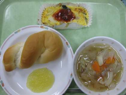 ミルクパン・スペイン風オムレツ・野菜スープ・牛乳・手作りリンゴジャム