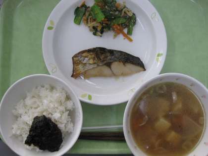 ごはん・さわらのしおこうじやき・ごまあえ・けんちんじる・手作りのりのつくだに