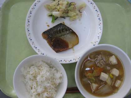 ごまごはん・さばのみりんやき・きゃべつとシーチキンのサラダ・どさんこ汁・牛乳