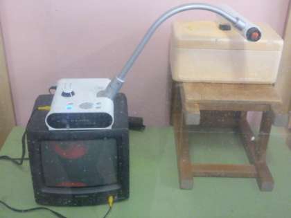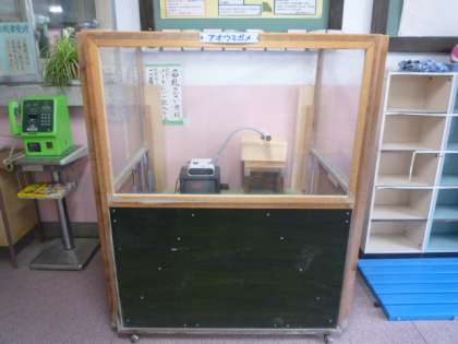 夕方、楚良先生と中山主事さん、鈴木主事さんで、アオウミガメが卵から孵化する様子を子どもたちに観察させるために、写真のような装置でモニターできるようにしました。写真の小さなモニター画面に丸く映っているのが卵です。10月4日が孵化予定です。楽しみに観察しましょう。