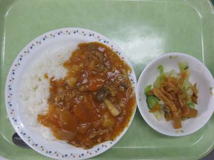 ハッシュドポークライス・カリカリ豆サラダ・牛乳