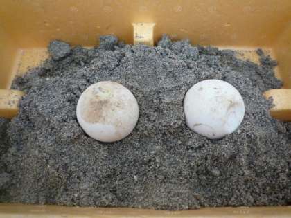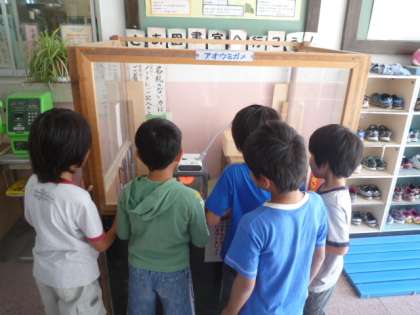 今日が、アオウミガメの孵化予定日です。子どもたちも、昨日全校朝会で校長先生から話を聞いていたので、まだかなとモニターをじっと見つめています。今日の朝、2個のうちの1個の表面の一部が少しへこんでいるのを見ていますので、もうじきだと思います。