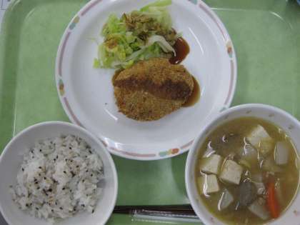 ごまごはん・肉じゃがコロッケ・ボイルキャベツ・豚汁・牛乳