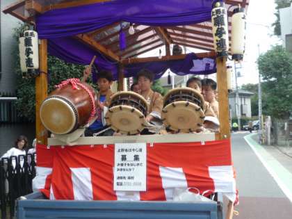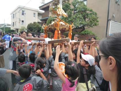 正午から上野毛の稲荷神社を出発して、神輿や山車が町の中を練り歩きました。その中の子ども御輿では、玉小の子どもたちがたくさん入って、一生懸命かついでいました。たくさんの町会の人たちに守られながら、子どもたちは貴重な体験をさせてもらっていました。山車の上では、玉小の1年生と5年生、6年生の3人の男の子がお囃子の太鼓を元気に叩いてくれていました。