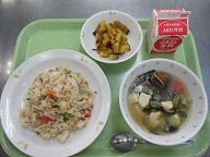 チャーハン・わかめスープ・キャラメルポテト・牛乳