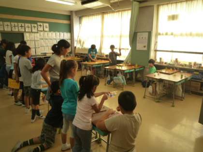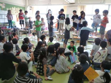 1,2時間目を使って、ミニ玉小祭りを行いました。ミニ玉小祭りとは、ペア学年の異学年同士の5,6人グループが、4,5,6年生の作ったゲームや遊びの教室を回って交流を深めるお祭りです。4年生は1年生と、5年生は3年生と、6年生は2年生とのペアでお店を回りました。それぞれのお店は、シンプルな作りですが、とても工夫された遊びやゲームで、子どもたちはとても仲良く交流して遊んでいました。上級生が下級生の面倒をよく見てくれている場面に出会いまいた。とてもいいお祭りで、これからの玉小の新しい行事になるかもしれません。