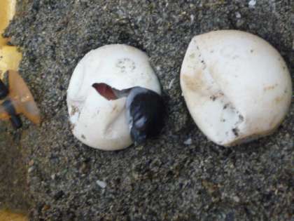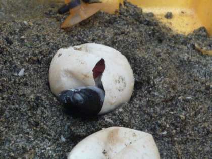 みんなが心配していたアオウミガメの孵化ですが、ついに今日の朝、1匹が卵の殻を割って、頭を出してきました。これから1日かけて殻から抜け出し、4,5日かけておなかの袋の中の栄養分を食べながら、水の中に入るまでの準備をします。予定日から10日余りたっていたので、子どもたちも心配しましたが、本当によかったです。もう1個の卵もまもなく孵化するのではないかと心待ちしています。皆さんにお目見えできるのは、もうしばらくお待ちください。