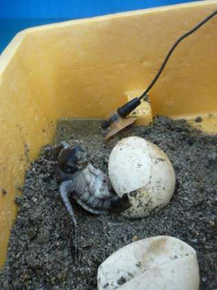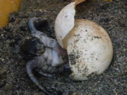昨日から丸1日かけて、2つ折りにしていた甲羅を開きながら殻から見事に出てきています。殻を前足で払う様子も似られました。元気に育てよ!もう1個の卵も表面が少し薄くなってきていますので、もうまもなく誕生かもしれません。