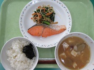 ごはん・さけのしおやき・ごまあえ・さつまじる・のりのつくだに・牛乳