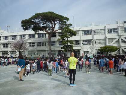 校庭での全校朝会です。1年生が入る場所をあけています。対面式が終わったら、全員そろう予定です。