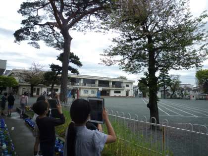 タブレットで桜を撮影し、観察しています。学習に効果的に使用するよう指導をしていきます。