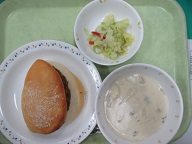 焼きカレーパン・きゃべつサラダ・クリームシチュー・牛乳