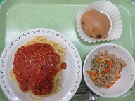 スパゲティミートソース・じゃこサラダ・蒸しパン・牛乳