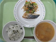 わかめごはん・さわらの塩麹焼き・ごまあえ・みそしる・牛乳