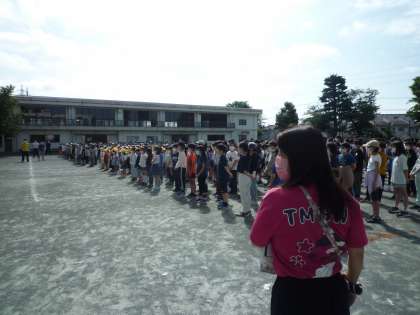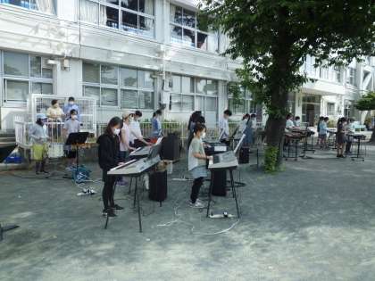 全校で音楽朝会をしました。久しぶりの校歌の練習です。子どもたちの演奏もとても上手でした。先生達のシャツには、校歌の歌詞が組みこまれています。