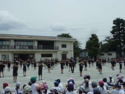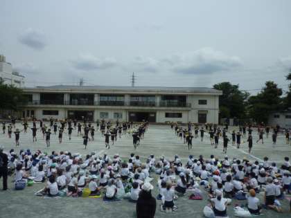 金色の扇子がそろい、迫力があります。「かっこいい!」の声が。大きな拍手をもらうことができました。