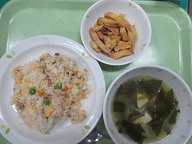 チャーハン・わかめスープ・キャラメルポテト・牛乳